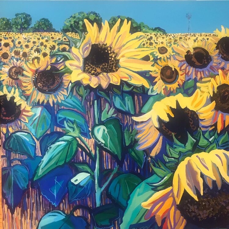 Artist Joel Schoon-Tanis, who was on the road with a show in Florida, hasn’t been able to create new art, but he has been dedicating some of his paintings that feature sunflowers to the Ukrainian resistance. He plans to paint new work in support of Ukrainians and peace.