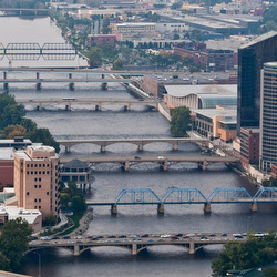 The Grand River and downtown Grand Rapids from 1200 feet in the air. Who knew that we had so many bridges? Photograph by Adam Bird, helicopter by Easy Rotor.