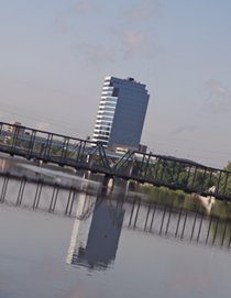 View from riverwalk toward the 6th St. Bridge and Bridgewater Place
