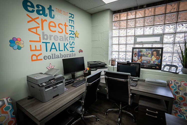 The lounge area Hickey recently renovated for her staff feels now like a conference room to Wasson. It boasts new computers and electronics, modern furniture, a small coffee and kitchen area, and fresh paint. A place for staff creativity, collaboration, celebration, and relaxation. “It makes you feel more professional, and the bright colors make you happy,” she says.