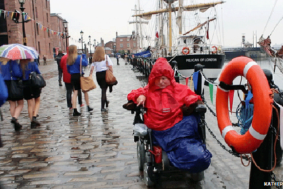 When Smit and I sat down to catch up about the trip, he and his wife, Elizabeth Van Arragon (Calvin College’s associate professor of art history), were fighting off the jet lag but still beaming from the excitement of having seen the artwork firsthand. Smit, already familiar with art and culture as the author of two books exploring the topic, shared insights from being a child and observing the world from the perspective of his chair as he walked me through works that included art on paper, ephemera, and even videos such as a 30-minute performance piece by artist Katherine Araniello whose work “Walking: Liverpool 2014” illustrates the artist trying to navigate her power wheelchair in the rain on cobblestone streets as people walk past with a sense of indifference.
