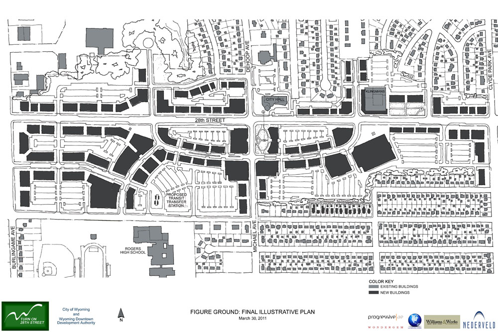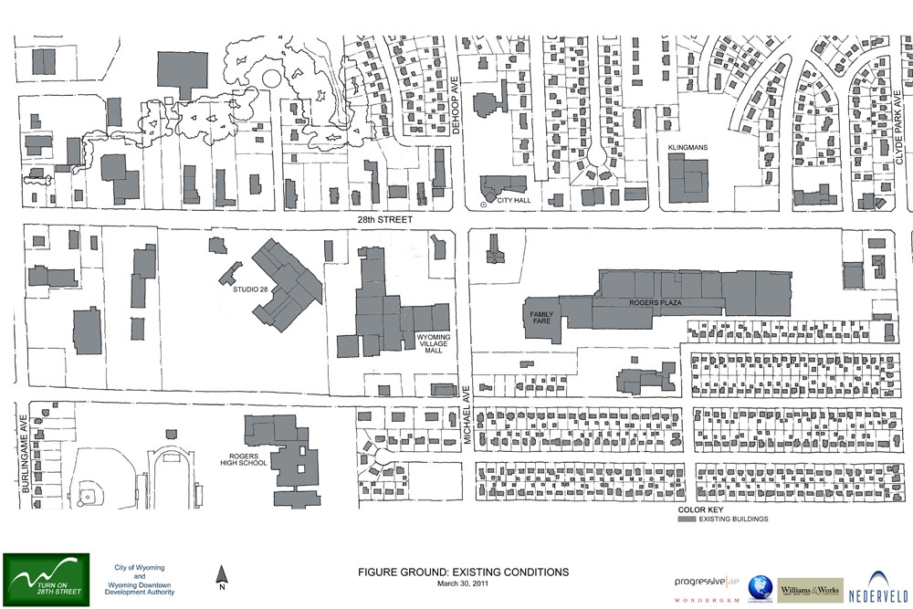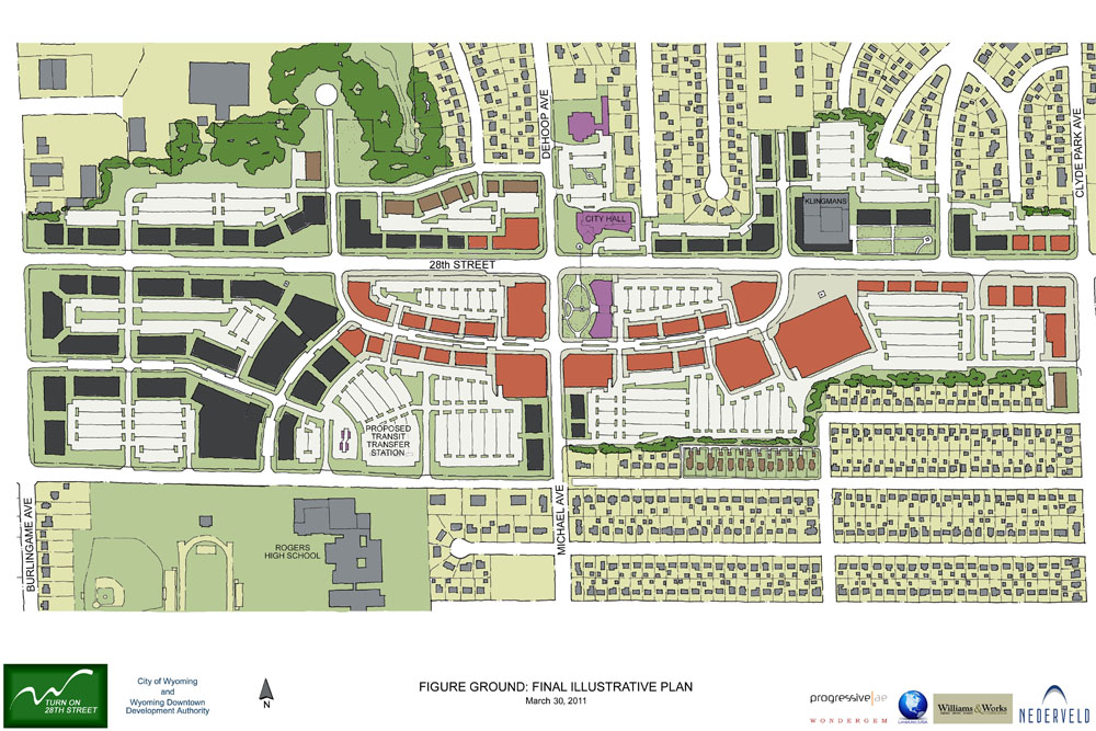 Today, the movie theater is closed, Rogers Plaza is only partially occupied and much of the destination shopping has shifted to more strategically located commercial centers. In an effort to reverse these downward trends, the City of Wyoming and the Wyoming DDA have launched a long-range planning and implementation process that commenced with the creation of a master plan that envisions a new future for the old corridor.