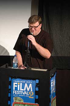 Michael Moore takes the podium at the Traverse City Film Festival