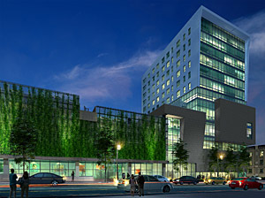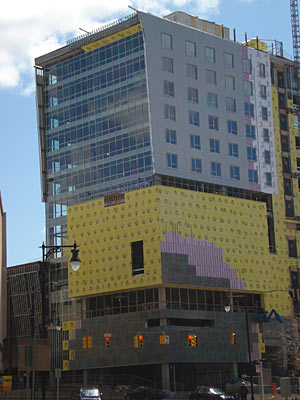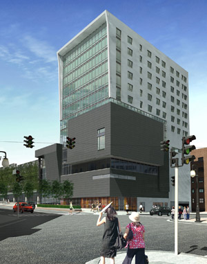 Studios and one-, two- and three-bedroom apartments make up the mix of residences. The units on the north side of the building have floor-to-ceiling windows; all of the sixth floor units share a band of glass that wraps the building, giving each of those apartments nearly floor-to-ceiling windows. The building will be LEED certified.