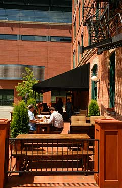 The new patio offers seating at traditional picnic tables, cushy loveseats and couches with low tables, sun-filled spaces and shady spaces created by a large black canopy and table umbrellas.