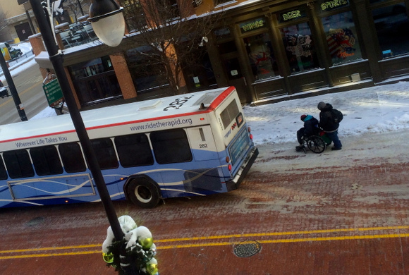 Yet as I returned to revisit many of the problem sites five days after the storm, I discovered we still have sidewalk and intersection ramps downtown that force people with mobility issues into the streets. At one intersection, a makeshift icy path wide enough for just one person to navigate remained as the only way to cross the street. Left unaddressed over time, these rough passages become a rock-hard ice mountain almost too dangerous to traverse.