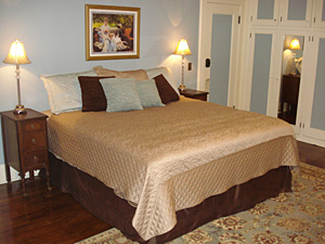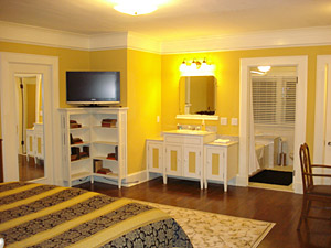 A wide, open staircase leads from the foyer to the five guest rooms on the second floor. Each guest room, tastefully appointed with period-style furniture, has a private bath. On the main floor, visitors will find a relaxing sitting room with a fireplace, a dining room and a modern gourmet kitchen.