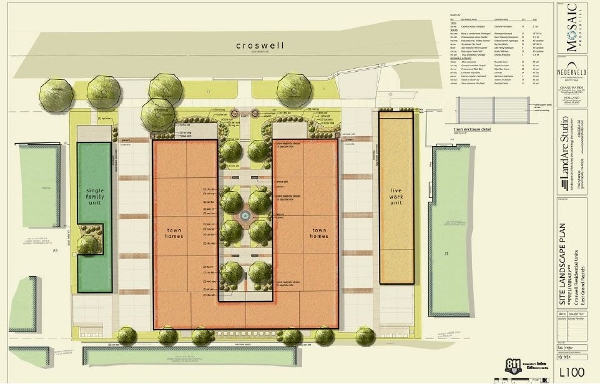 The project, the first of its kind in East Grand Rapids, will include twelve residential units, 2000 square feet of office space, and 1200 square feet of ground floor retail. Ten of the residential units will be three-story townhouse units surrounding a courtyard with enclosed parking facing the rear of the buildings. The project will also feature a 2000-square-foot penthouse with an elevator and a three-story live-work unit.