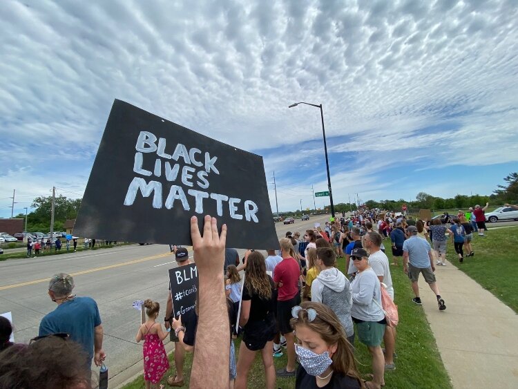 Marchers in medical masks carried signs with slogans such as “Black Lives Matter,” “Stand for Change,” “If not now, when?” “Can you breathe?” and “How many weren’t filmed?” as they marched in the grass along Douglas Avenue toward Unity Bridge, which crosses the Macatawa River and connects the city of Holland and Holland Township.