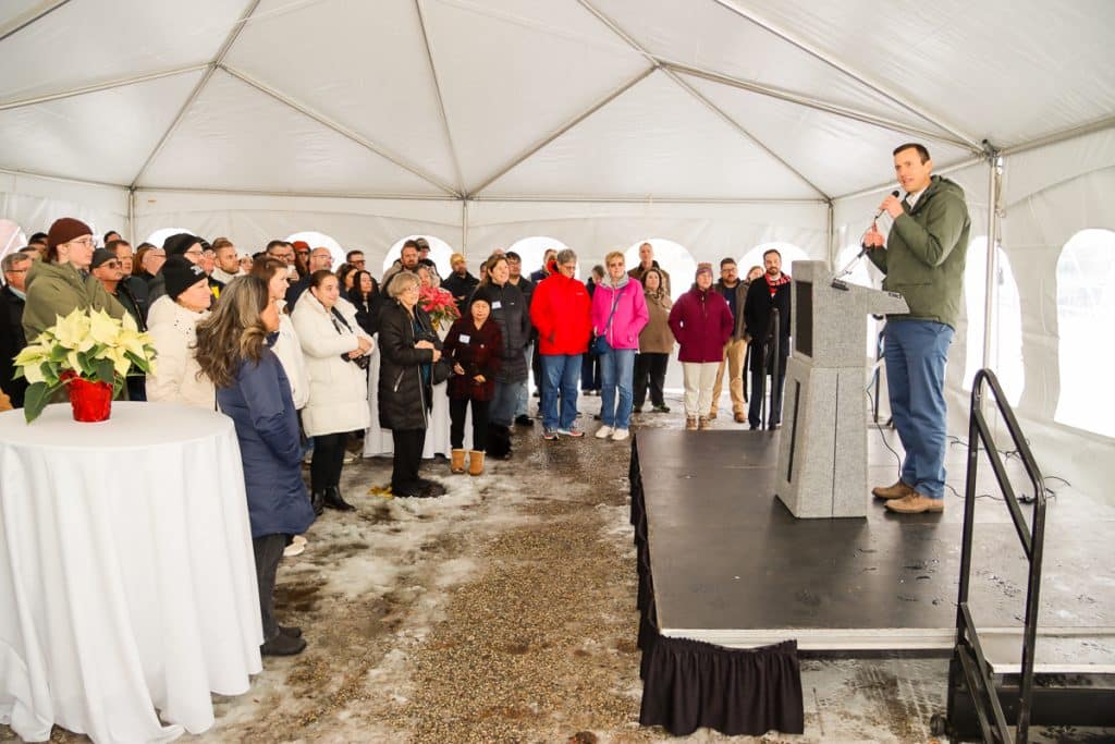 On this chilly morning in Holland, giant snowflakes blew in from Lake Macatawa, causing folks looking to attend the noon groundbreaking to seek warmth before the ceremony.