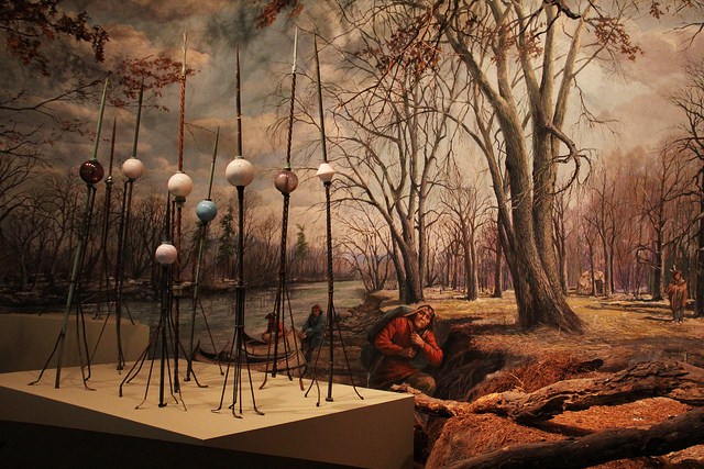 According to Amenta, French-born artist Nicolas Touron generally exhibits in stark white gallery spaces. But after seeing one of his works recently, Paul thought Touron would be perfect for a grass- and tree-filled diorama in the museum. Touron responded fabulously. In it, he places a large giraffe made of mirror like metal plates, which seem to both reflect images and create a transparent like appearance. Is it one giraffe or two? You decide.