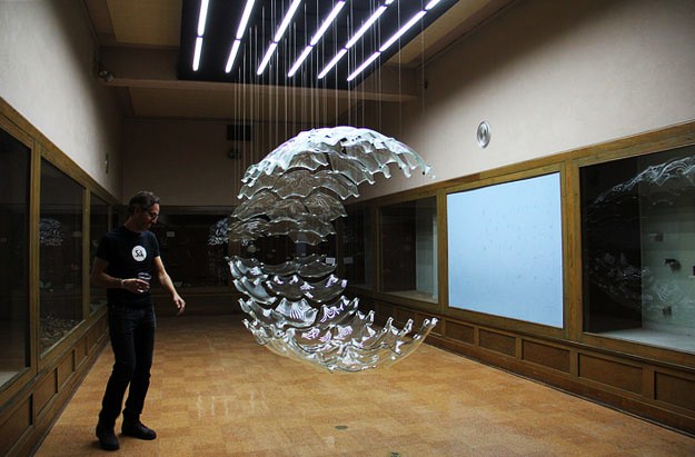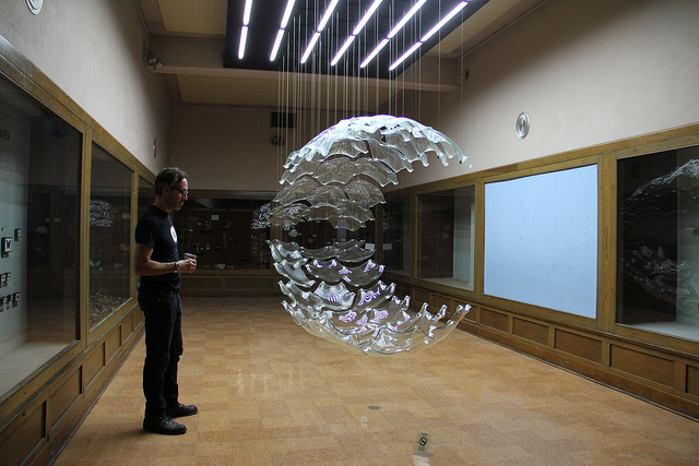 Think of every Ridley Scott science fiction/horror movie you’ve seen, and you’ll get a good idea of the impression that Specimen leaves. Ann Arbor-based architects Wes McGee and Catie Newell return to ArtPrize this year (at GRAM last year) to partner on this large-scale glass sculpture using “catenary slumping.” The lights and superstructure supporting the heavy glass weight (somewhere in the hundreds of pounds we imagine) are positioned very carefully to create an interesting bending of light in the forms. “Cut the power? How could they cut the power, man??!!” – Lt. Hudson, Aliens