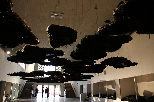 De St Croix has done quite a bit of work surrounding global and geopolitical struggles, using large scale sculptural works. This is the “hanging clouds” exhibit in the main Grand Hall of Site:Lab that you’ve probably seen online recently. The green and gray stickly cloud-like forms are meant to represent islands of destruction and regeneration, as was exhibited in massive grass fires in the Florida Everglades in the last few years. Be sure to check them out from below and above, as their impression changes from each direction.