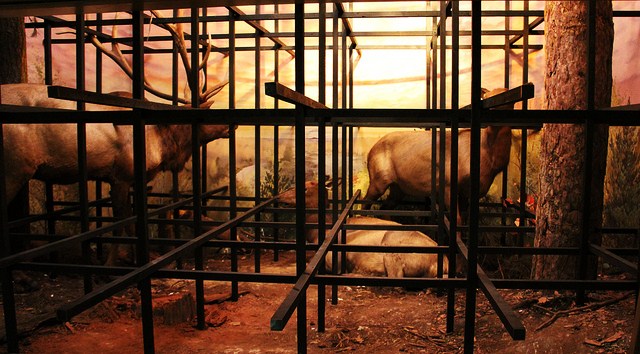 This is obviously one of Paul’s favorites this year as well. You may remember Kronschlaeger’s large grid structure rising up out of the old elevator shaft of the JA Building last year, puncturing right out of the top of the building. This year, Alois took over 12 — yes, 12 — of the museum dioramas and built diorama-specific grid and screen structures in each. One even allows you to walk into the diorama and turn around toward the lights, giving you a firsthand view of what it feels like to be a stuffed fox hiding in the bushes with its young pup. The most moving diorama for our group was a family of elks, seemingly trapped in a gridded cage, with the male appearing to be skewered by the grid.
