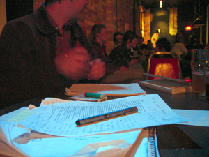 The poets this Monday night included event regular “Joe, the cab driver”, a 33-year old cabbie who lamented his “life has been horrible beyond belief.” The weekly slam is his catalyst for creativity, his outlet, his church. It appears that he’ll write about anything, nothing is off limits. He carries a sizable stack of his poetry with him in a worn black duffle bag.