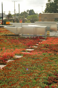 The most remarkable visual feature of my building doesn’t reveal itself until you go up on the roof and see the garden in full bloom. This feature, which incorporates relatively cheaply into LEED buildings, links with a rain garden adjacent to the parking lot and treats, for free, all the rainwater that falls on our site.