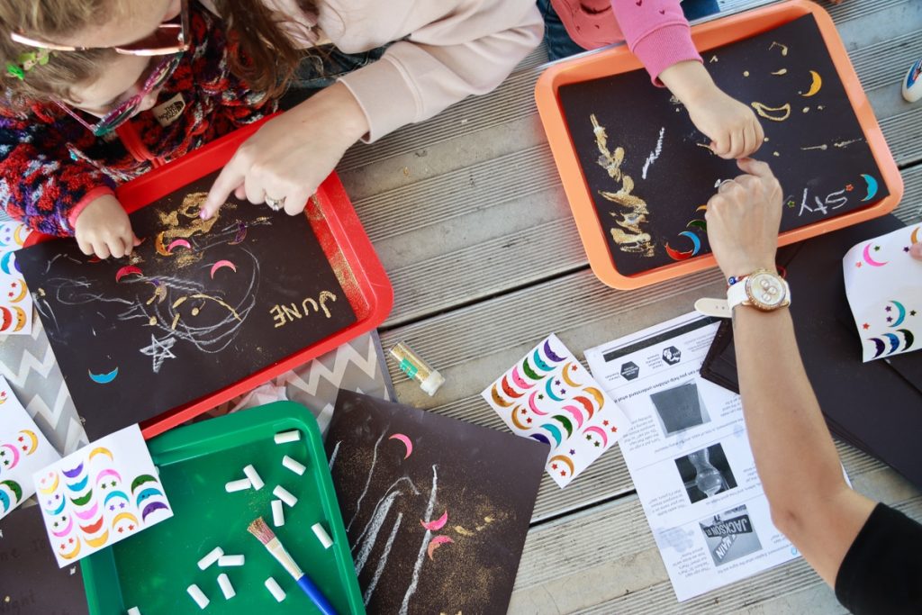 Those opportunities, she adds, are not always formally planned lessons. Sometimes they are spontaneous, like jotting down a snack order or labeling artwork together.