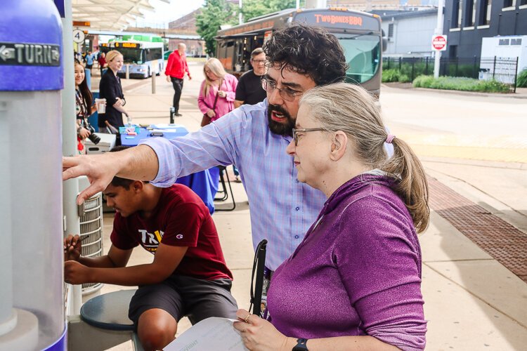 A Rapid team member assists Gail Mancewicz, who has limited vision.