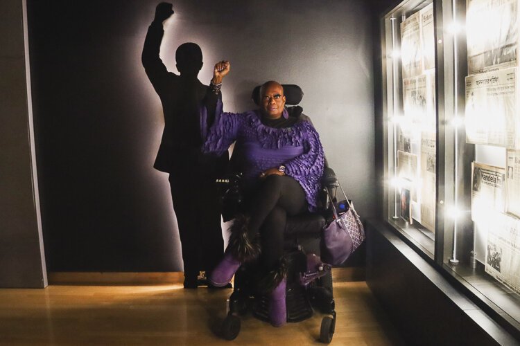 Kimberly Kennedy-Barrington raises her fist to join Mandela at the exhibit.