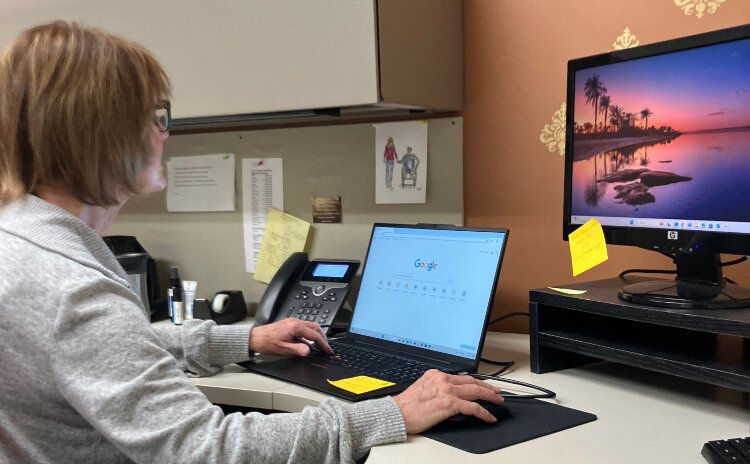 Barb Olsen, an event and volunteer specialist with Disability Network West Michigan, works at her desk.