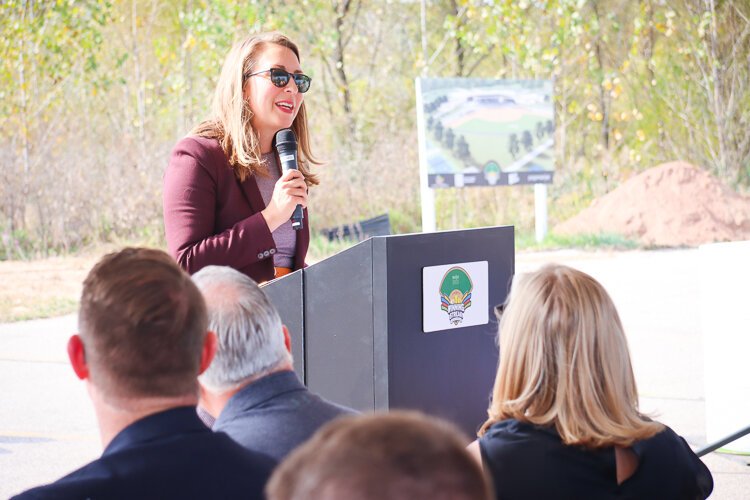 “Today is possible because everyone here came together – public organizations, private corporations, government agencies, and even individuals – united in a singular cause of creating more spaces for youth and amateur athletes to recreate in West Michigan,” Guswiler says to about 50 people who gathered on this sunny, fall day. “We are so grateful to all of you for sharing in our vision of building up our region from an economic, health, and wellness standpoint through sport.”