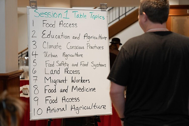 After Darwich concluded presentations with information about GVSU’s farm and how it involves and feeds students at the university, the group engaged in round table discussions about access to land, food and medicine, migrant workers, climate-conscious practices, urban agriculture, education and agriculture, food safety and food systems, and animal agriculture. As tables reported out, a common theme was the need for addressing institutional racism and living wages as a means to ensure just food production and access.