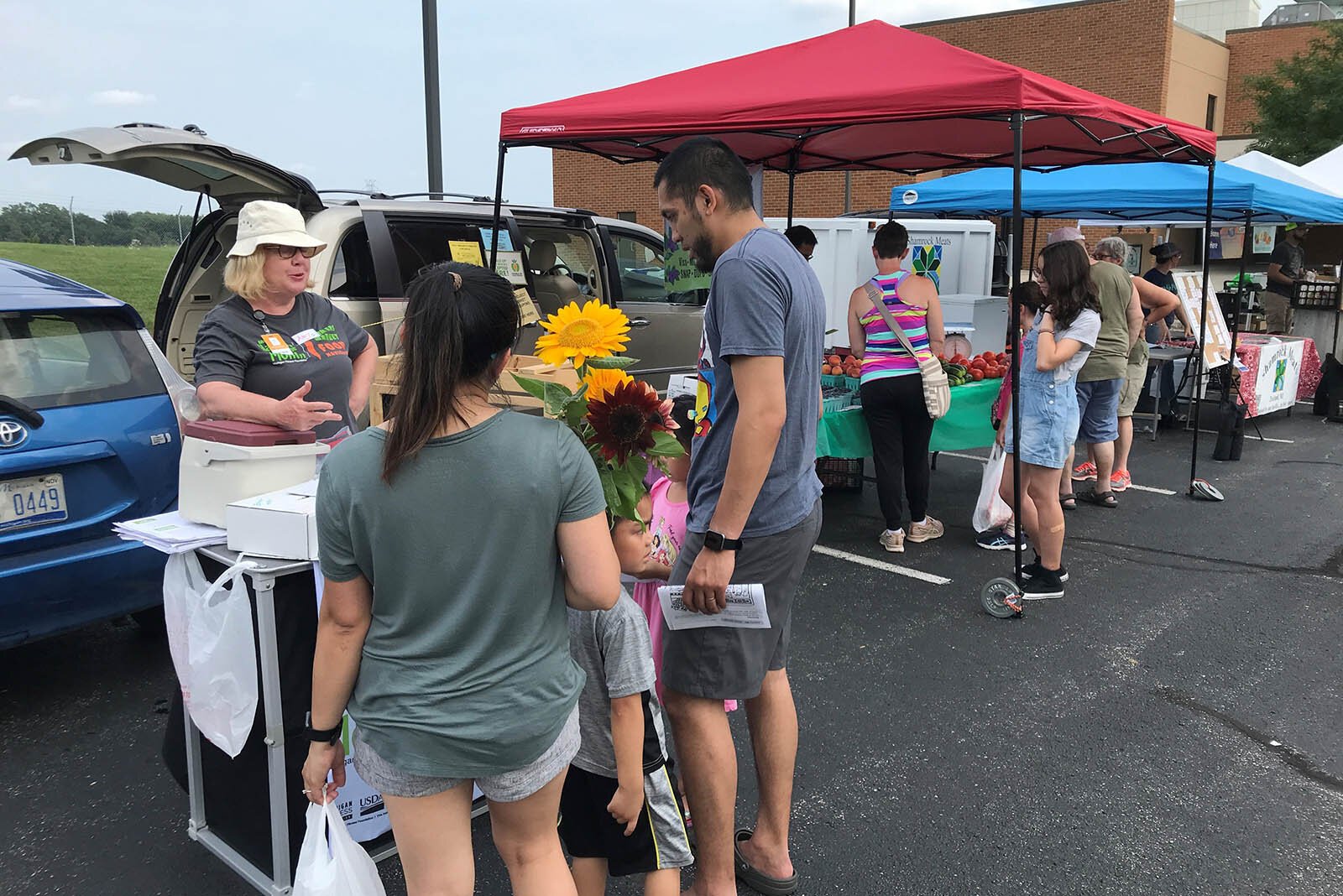 Klinkoski noticed that the library also served as the site where families that receive free or reduced-price lunches were coming to pick up meals at the library during the pandemic. The lunch program for students and neighbors is known as “Library Lunches to Go” and the meals are distributed in partnership with Feeding America West Michigan. The shelf-stable meals help improve access to nutritious food during the summer months. In her FMFN role, Klinkoski saw an opportunity to introduce fresh produce from the market to the families picking up the Library Lunches to Go. She approached KDL to propose a collaboration where she could share the health benefits of fruits and vegetables with the families picking up the Library Lunches to Go, and KDL agreed. Through this collaboration, she began to serve more families, providing them with information about how to use their food assistance benefits at the market, sharing recipes that feature Michigan-grown fruits and vegetables, and offering tastings of those recipes.